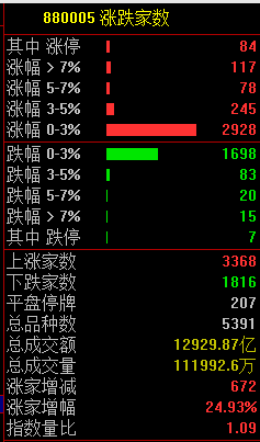 阛阓共3368只个股上升,84只个股涨停,1816只个股着落。